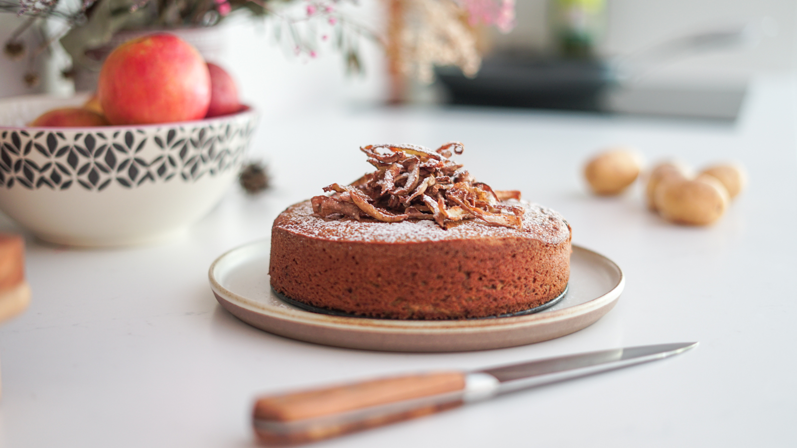 - Démoulez tiède et laissez refroidir avant de déguster décoré des chips d’épluchures.