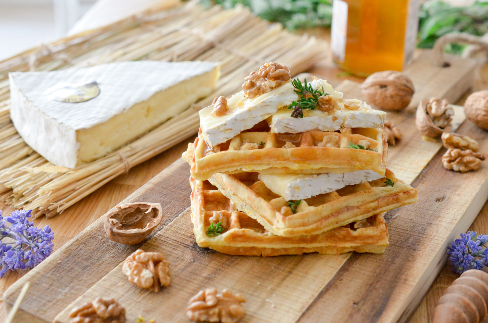 - Sur vos gaufres, disposez quelques lamelles de Brie, des noix, un filet de miel et un tour de moulin à poivre. Dégustez chaud !