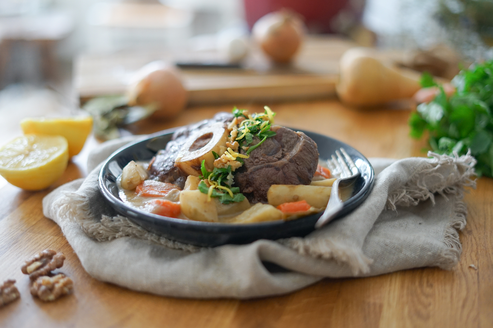 En attendant, voici ma petite recette. Le secret ? Une viande mijotée dans du cidre avec des légumes fondants, et une sauce onctueuse réalisée en un clin d’oeil en mixant une partie des légumes avec les jus de cuissons. Une belle astuce qui vous permet de gagner en onctuosité, sans forcément rajouter trop de beurre ni de crème. Pour pimper le tout, je vous ai préparé une garniture à base d’herbes, de noix et de citron, un délice !