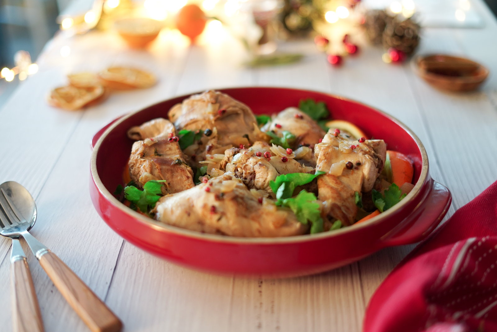 Pour parfaire la décoration (et le goût), ajoutez des quartiers d’oranges 10 minutes avant la fin de cuisson du lapin.