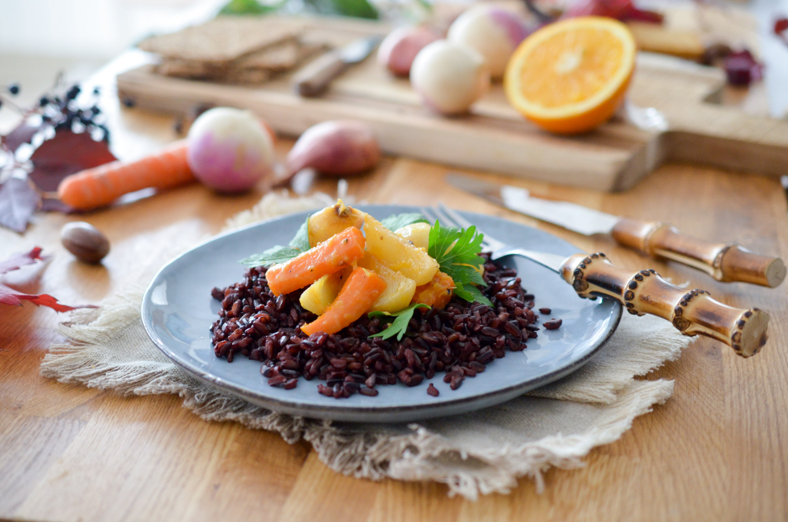 Ici je vous ai préparé des légumes glaçés à l’orange et au gingembre, un duo de saveurs hivernales que j’adore. Servis sur un lit de riz noir, vous avez là une assiette pleine de couleurs et de saveurs. Le riz noir reste assez croquant et a un goût bien différent du riz blanc classique. Il est un peu long à cuire, mais croyez-moi, ça vaut l’attente.