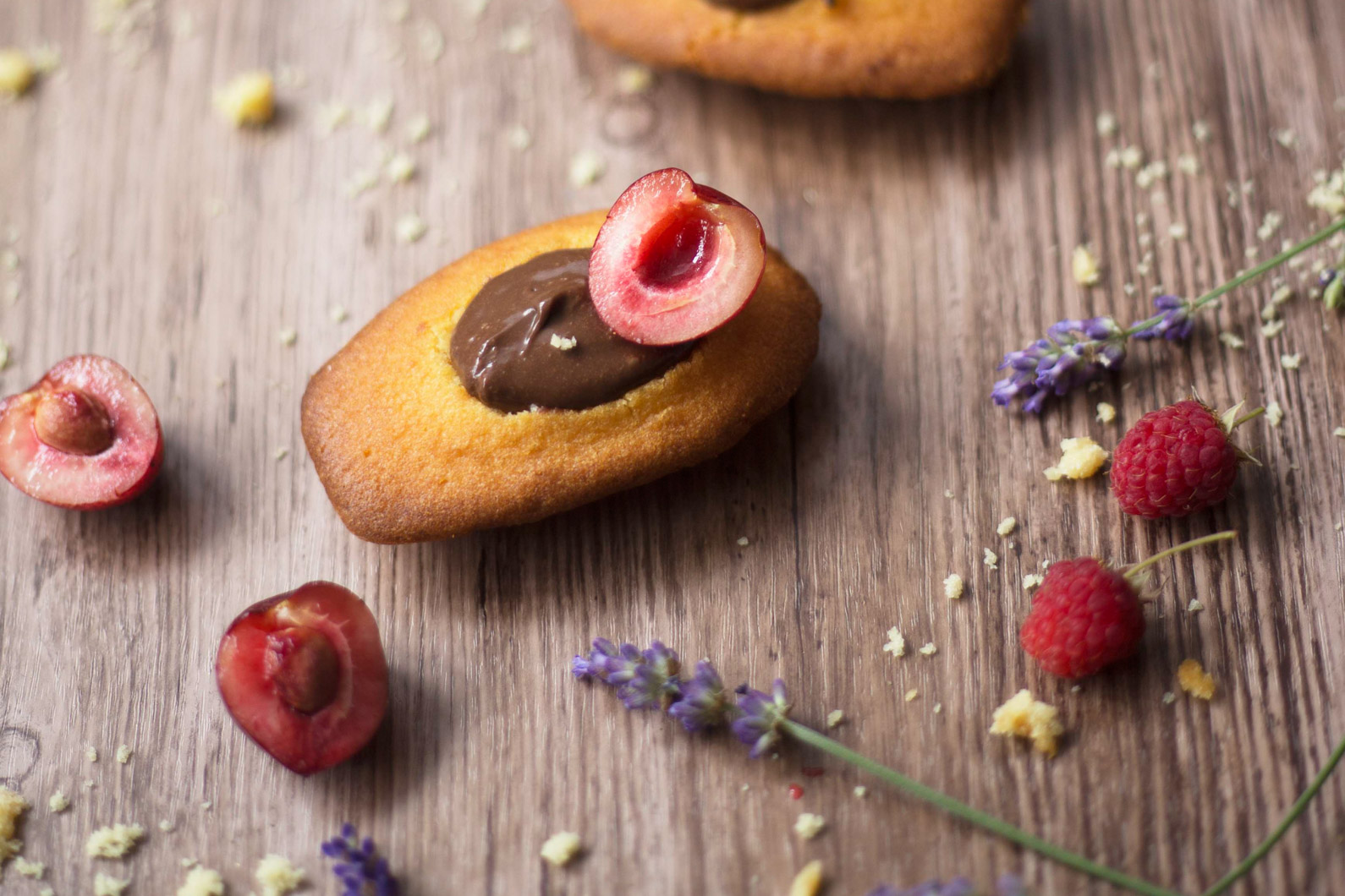 - Dans un bol, mélangez très délicatement la mousse avec le zeste de citron et les copeaux de chocolat. Déposez cette mousse dans chaque madeleine, ajoutez une demie cerise (ou une framboise ou un morceau de fraise), et servez sans plus attendre !