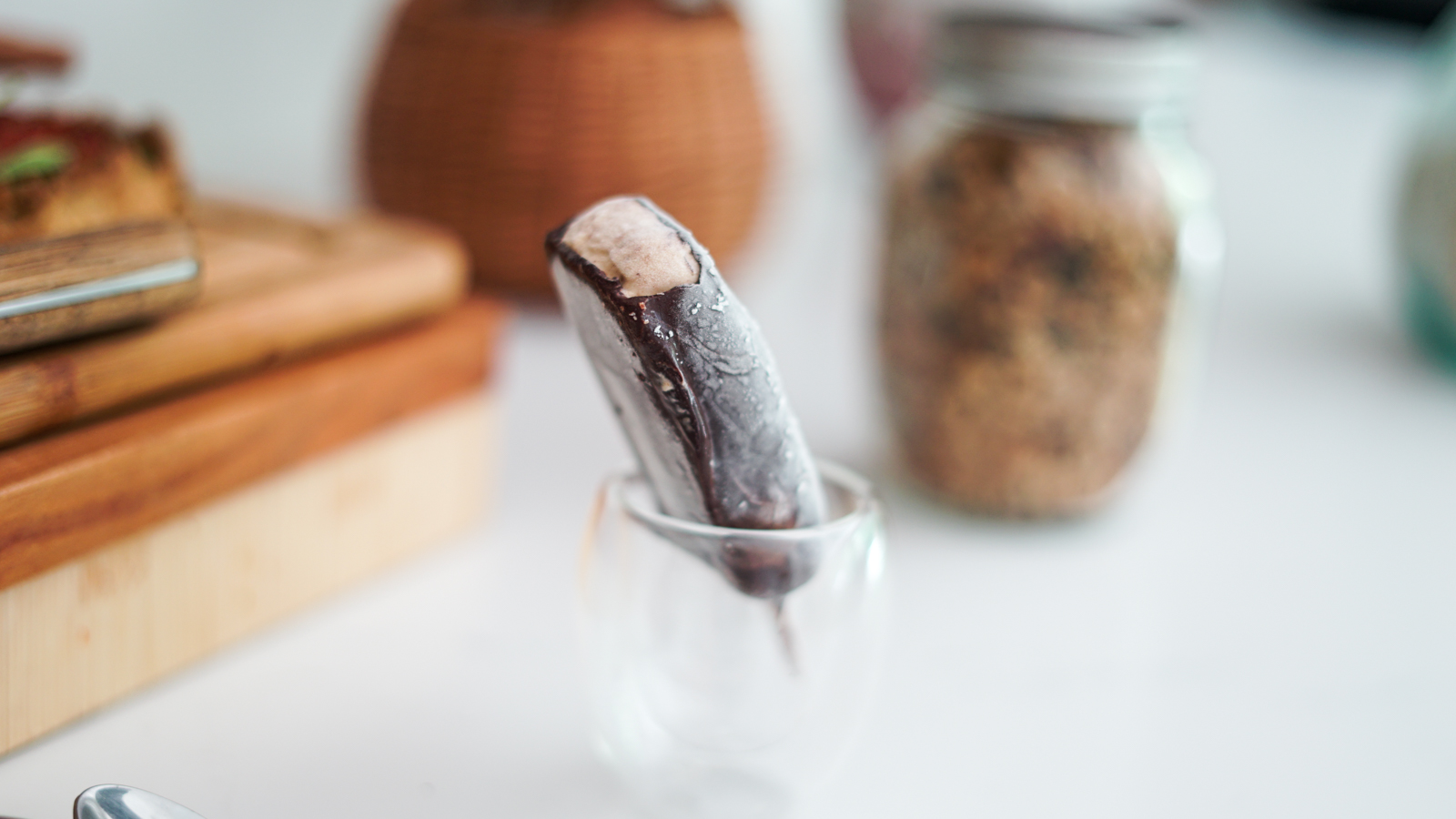 - Lorsque les magnums sont bien congelés, faites fondre le chocolat avec l’huile de coco au bain marie. Laissez tiédir.