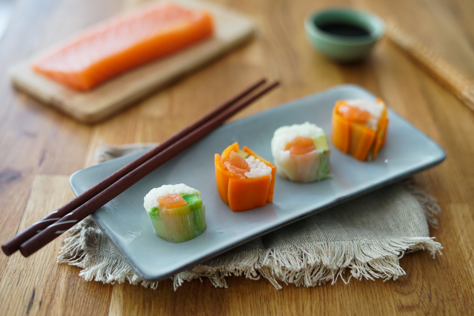 J’ai voulu « repenser » un peu ici les makis classiques japonais en y apportant un peu plus de légumes. Résultat ? Vous avez ici la même base mais au lieu de mettre une feuille d’algue en guise de contour de la farce au riz vinaigré, j’y ai mis des légumes de saison. A la fois frais, original et coloré !