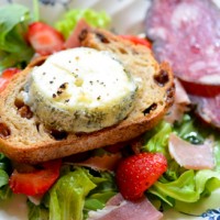- Pour la salade, placez un lit de salade sur chaque assiette. Ajoutez les fraises coupées en fines lamelles, les abricots secs et des petites lanières de jambon de Parme.