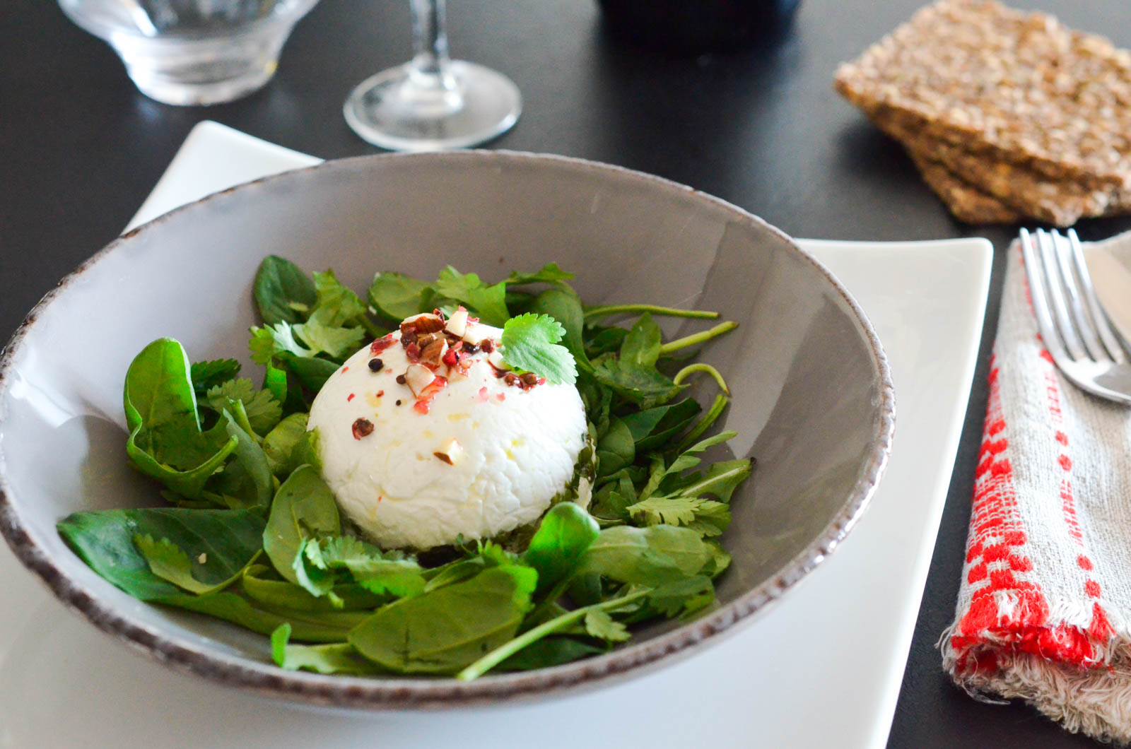 Si possible, placez au frais jusqu’à une nuit entière ou dégustez de suite en arrosant d’huile d’olive, du restant d’amandes torréfiées et d’un peu de baies roses concassées.