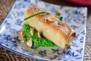 - Dans une petite assiette creuse, versez une cuillère à soupe de votre crème de persil et posez le nem au dernier moment.