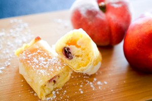 - Lavez les pêches, et coupez-les en petits cubes. Coupez chaque feuille de brick en deux.