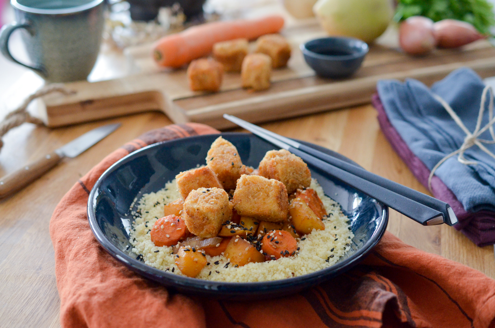 - Dans vos assiettes de service, disposez un lit de semoule égrenée, ajoutez les légumes sautés, les nuggets de tofu, parsemez de graines de sésame et servez accompagné de votre mayonnaise asiatique et du complément de sauce soja au besoin.