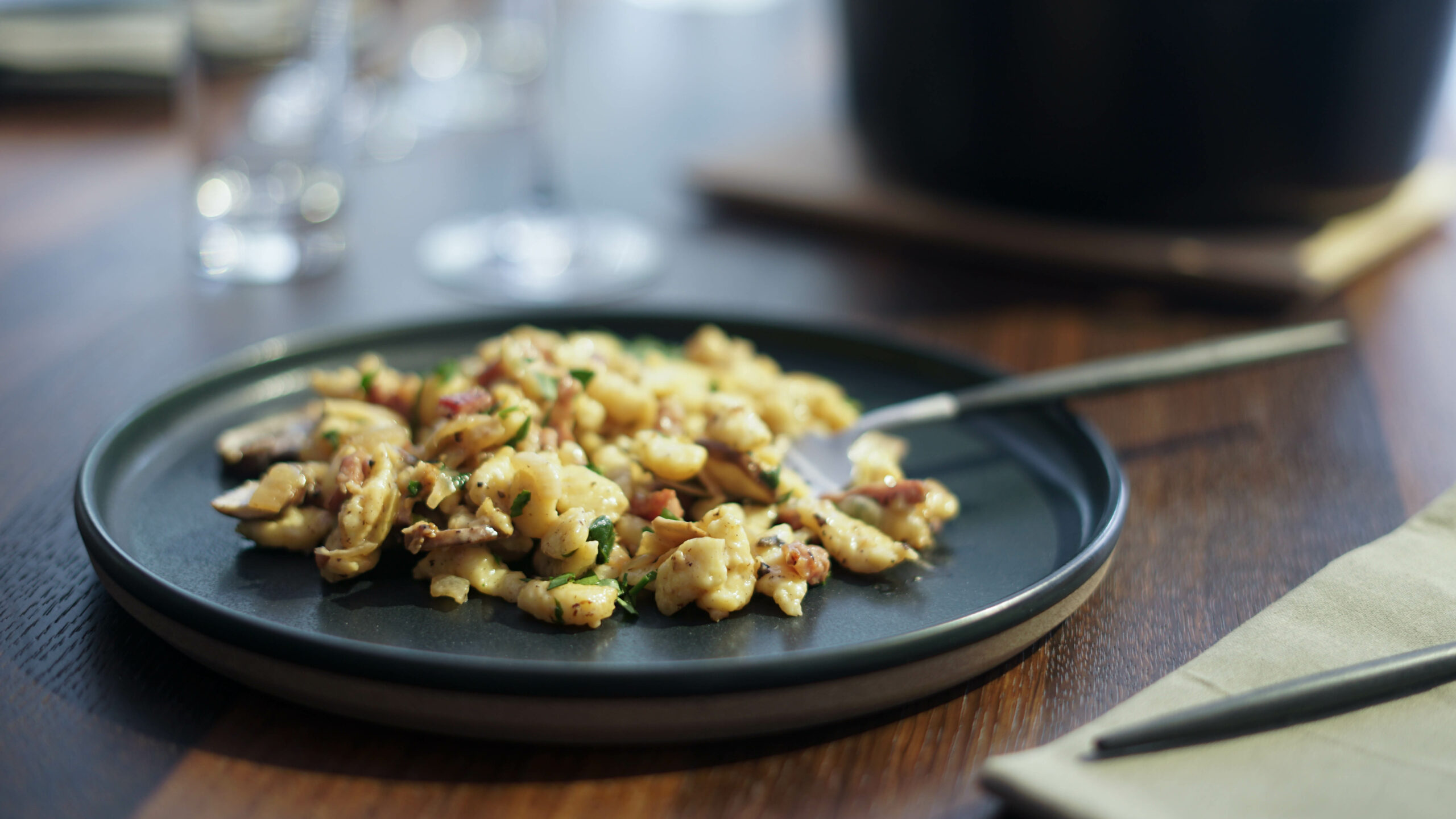 La méthode de cuisson peut varier selon si vous utilisez des spaetzle frais ou secs. Si vous utilisez des spaetzle secs, incorporer-les en même temps que les champignons. Ajoutez de l’eau ou du bouillon, et laissez cuire à couvert environ 10 minutes avant de poursuivre les autres étapes.