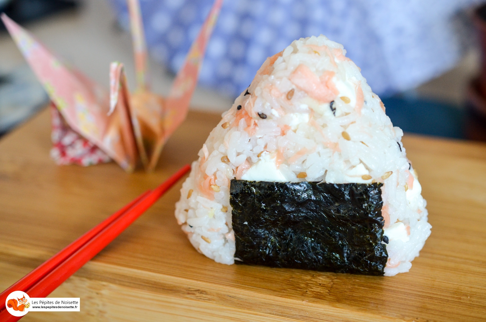 Rappelez-vous, je vous avais fait découvrir il y a peu les onigiris, ces triangles de riz vinaigré, garnis et entourés d’une feuille d’algue. Je vous avais également promis de vous en donner une recette. C’est chose faite… sauf que je n’ai pu m’empêcher d’en faire une version détournée, façon Noisette, en y apportant une touche d’originalité en y intégrant du Pouligny, un fromage de chèvre qui s’associe parfaitement avec le saumon.