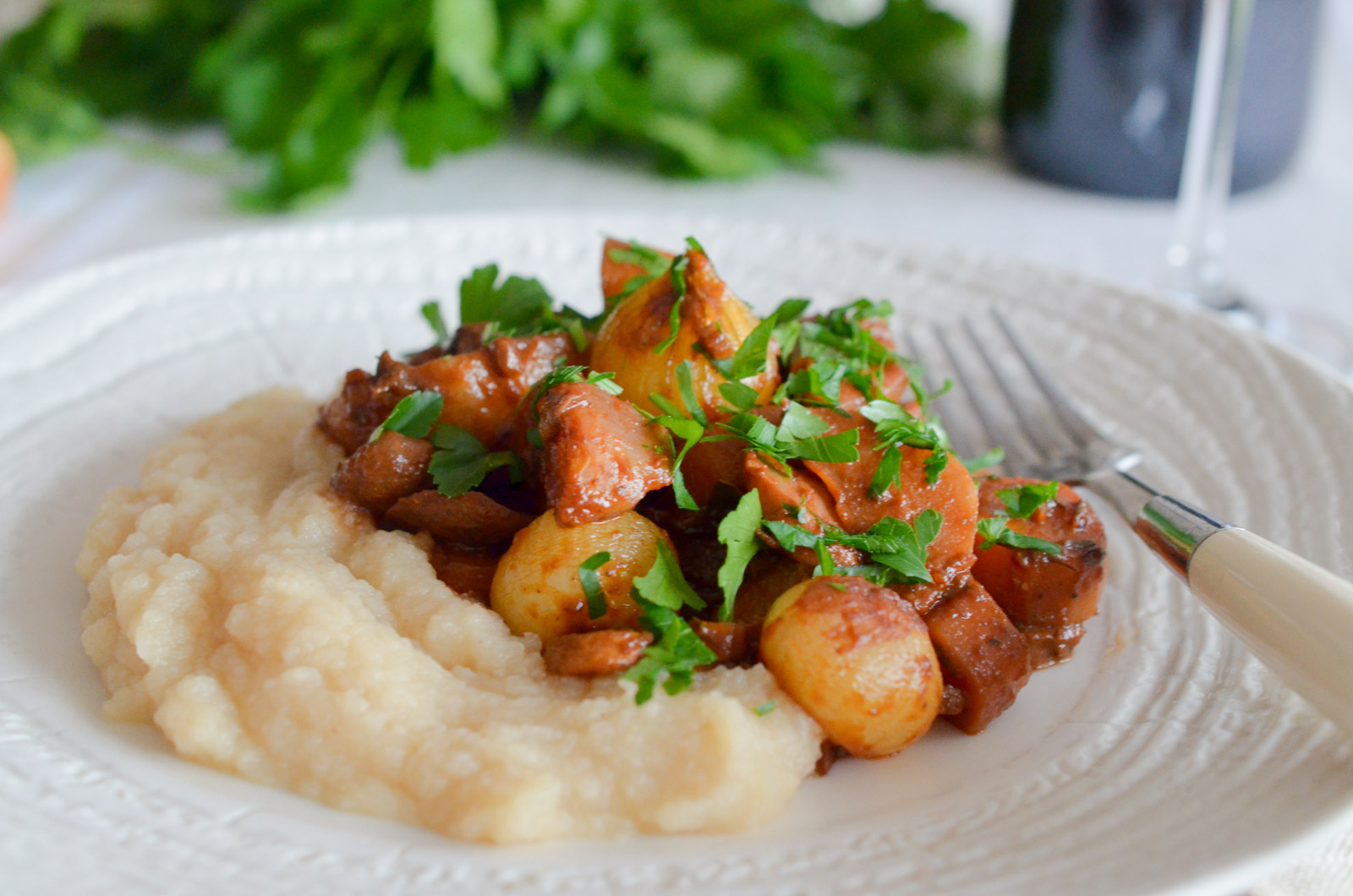 Servir un lit de purée de céleri surmonté de votre osso bucco de légumes. Parsemez généreusement de persil.