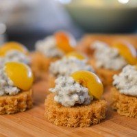 - Répartissez sur vos rondelles de pain d'épices et ajoutez la moitié d'une mirabelle sur chaque bouchée.