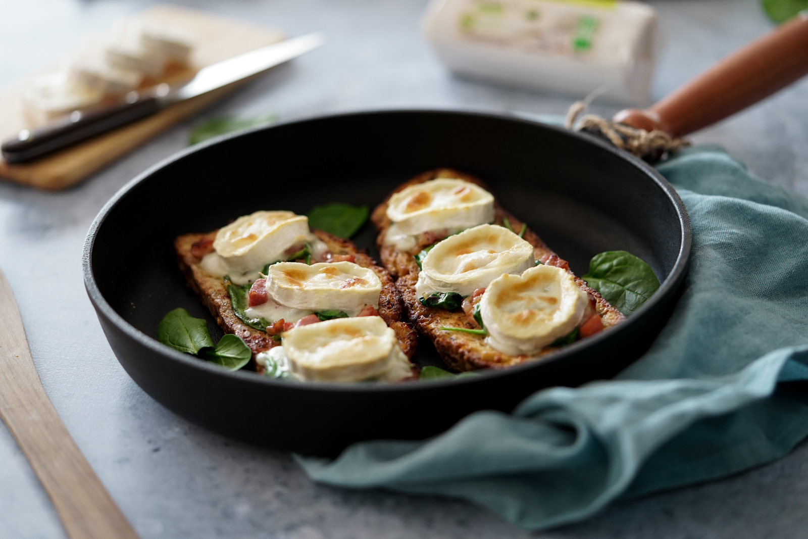 - Disposez vos tranches de pain perdu sur une plaque de cuisson. Ajoutez au centre quelques cuillères de poêlée de lardons aux épinards. Disposez ensuite quelques rondelles de chèvre et enfournez quelques secondes jusqu’à ce que le fromage soit juste gratiné.