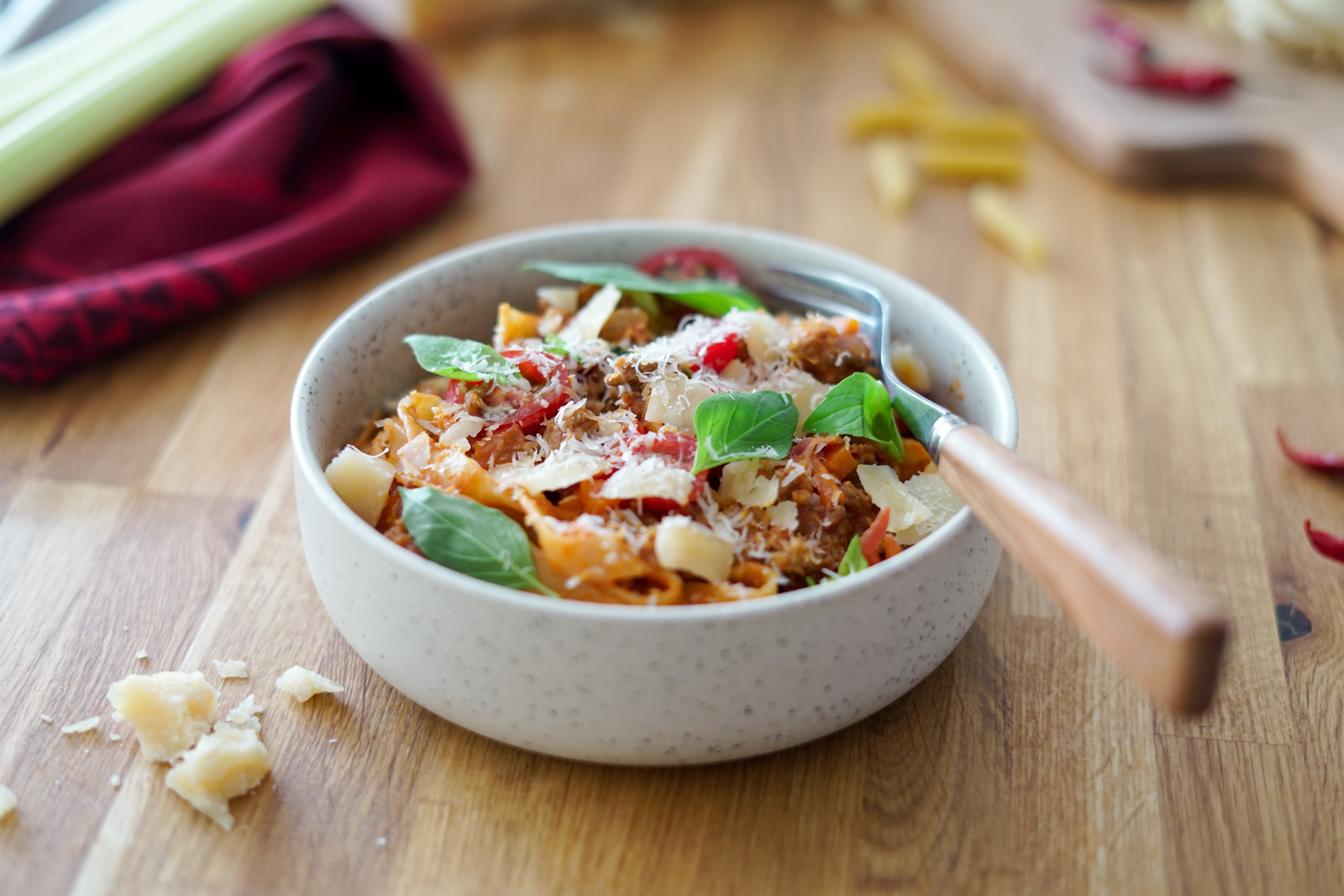 Mama mia ! Qui n’aime pas un bon plat de pâtes, honnêtement ? :-) Je vous ai préparé ici des « Pasta al Ragù« , comprenez des pâtes avec une sauce tomates mijotée longuement avec de la viande. Ici la recette que j’ai testé est extraite du magazine Elle à Table, d’ailleurs je vous l’ai mise en vidéo si vous voulez voir les détails. Et le verdict est vraiment top !