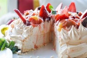 - Posez délicatement la meringue sur un plat de service. Recouvrez le dessus de votre mousseux citron. Ajoutez ensuite la rhubarbe et une couche de fraises fraîches coupées en quartiers. Parsemez de quelques cuillères de lemon curd pour apporter une touche de couleur et décorez avec quelques amandes effilées grillées ou des pistaches non salées.