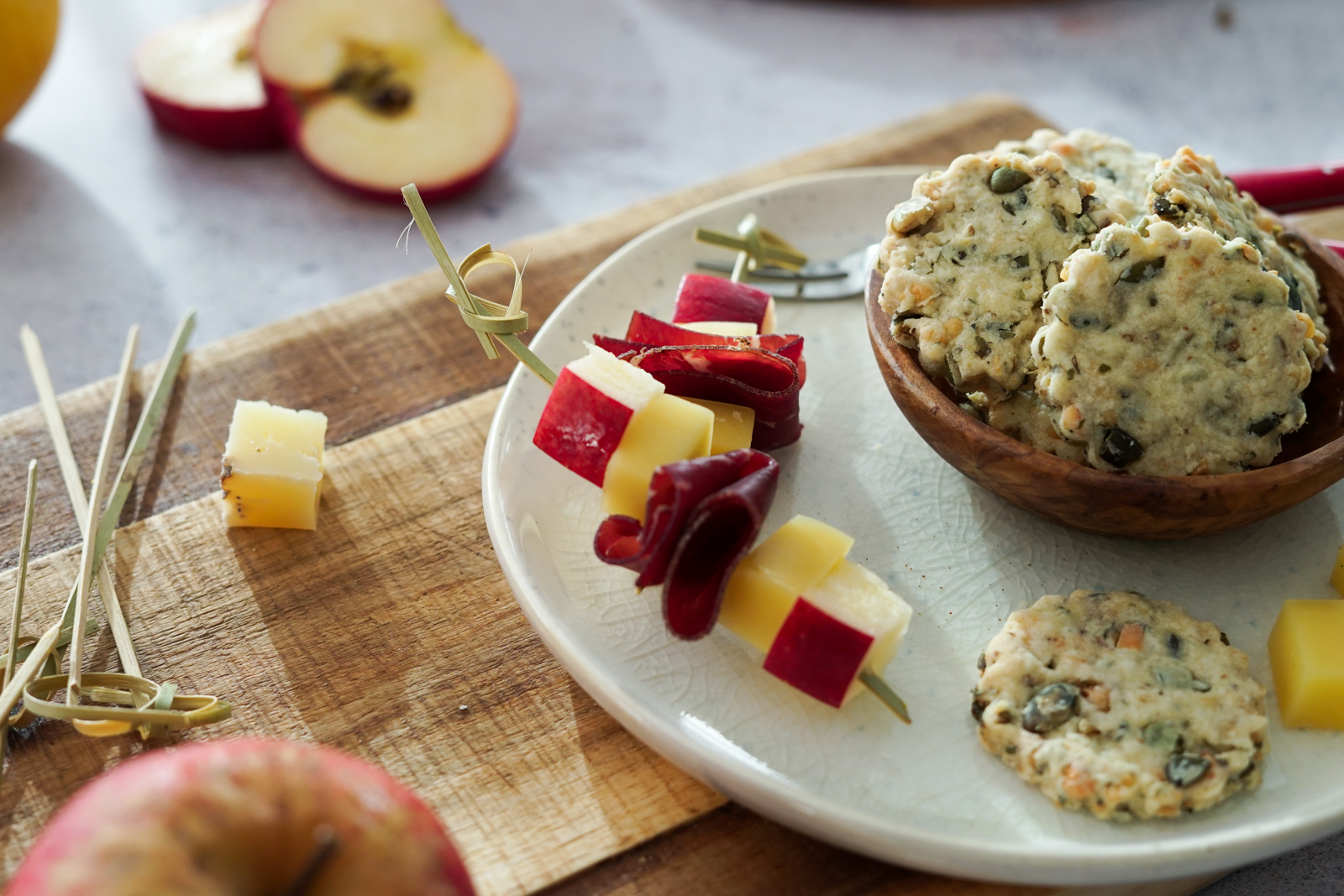 - Sur vos pics apéros, alternez des morceaux de pommes, de fromage et de viande de grison.