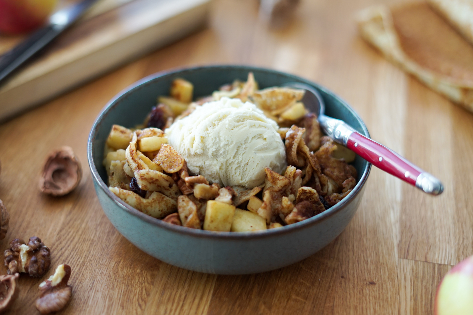Le résultat est vraiment top ! Je vous ai donc fait une interprétation toute personnelle de poêlée de crêpes aux pommes et à la cannelle avec une touche de noix et de raisins secs. C’est tout bête et pourtant c’est très bon. Vous pouvez également utiliser d’autres fruits en fonction de la saison, comme des myrtilles, de la banane, des poires avec des pépites de chocolat ou autre. Laissez libre cours à votre imagination !
