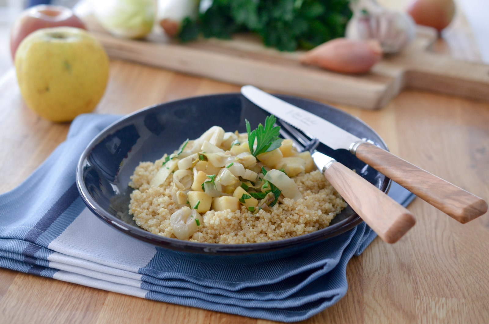 Une poêlée d’hiver simple et toute douce comme on les aime ! L’endive et la pomme font un excellent duo aussi bien froid que chaud. Souvent associé à des pommes de terre, j’ai choisi de les servir sur un lit de quinoa pour apporter à cette assiette un peu de protéines végétales.