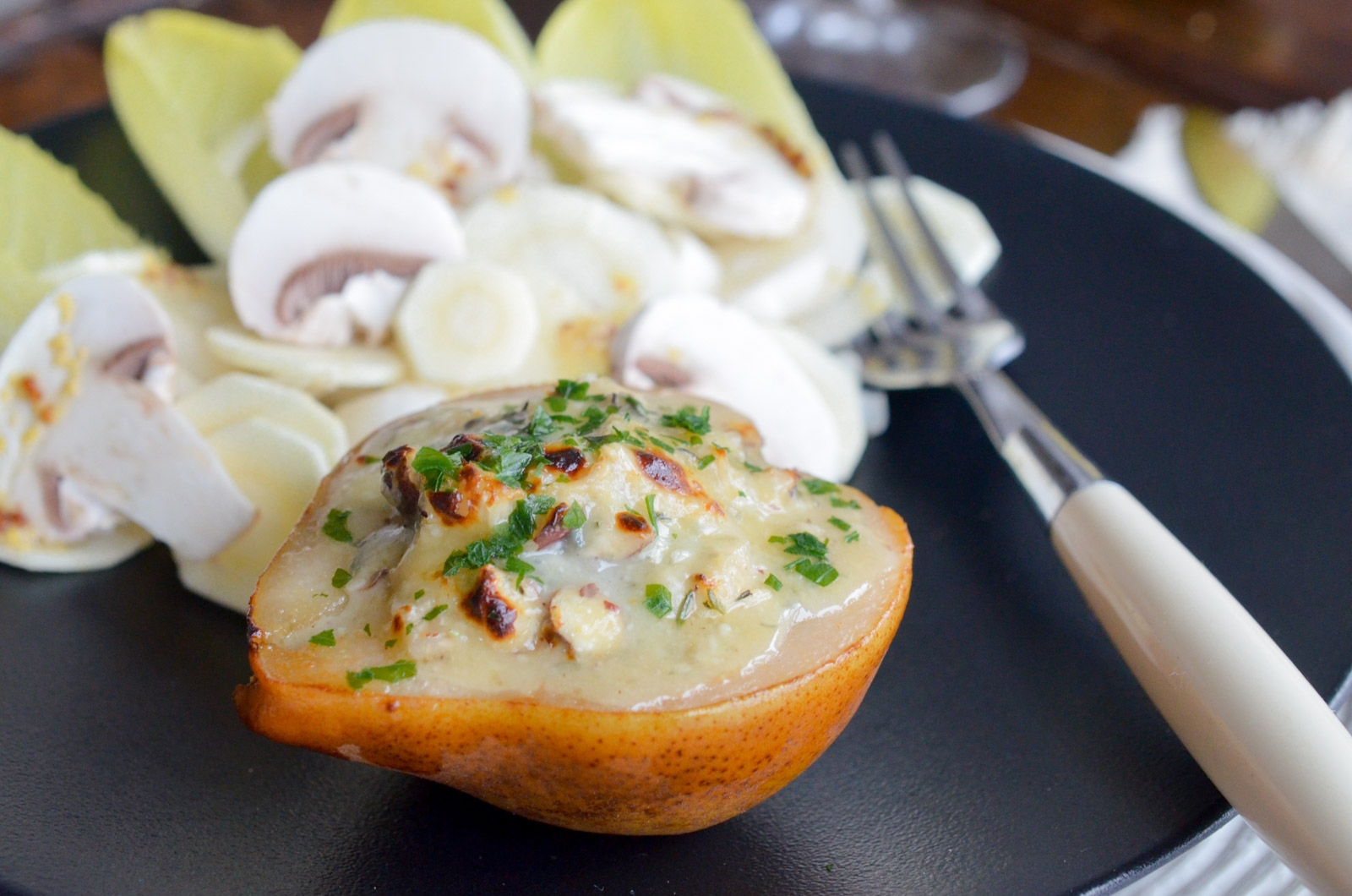 - Lorsque les poires sont juste fondantes, placez-les sur une grille ou dans un plat supportant le grill du four. Garnissez de mélange au bleu et glissez au four 2 minutes, juste de quoi faire légèrement gratiner le fromage.