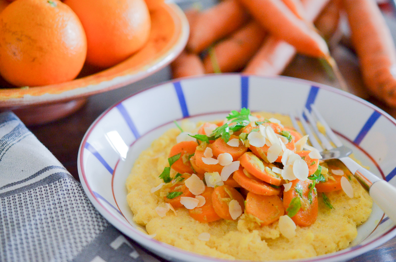 Servez la polenta dans vos assiettes en disposant les carottes sur le dessus parsemées de persil et d’amandes.