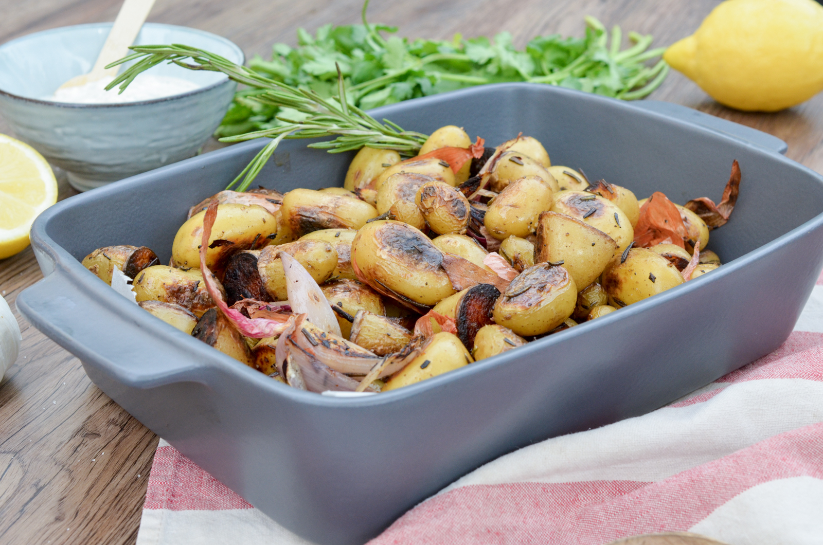 Des pommes de terre, quelques échalotes, un peu de romarin et hop le tour est joué. Si vous voulez pousser un peu plus loin, je vous propose ma recette de sauce au yaourt aux herbes qui se marie divinement bien avec.