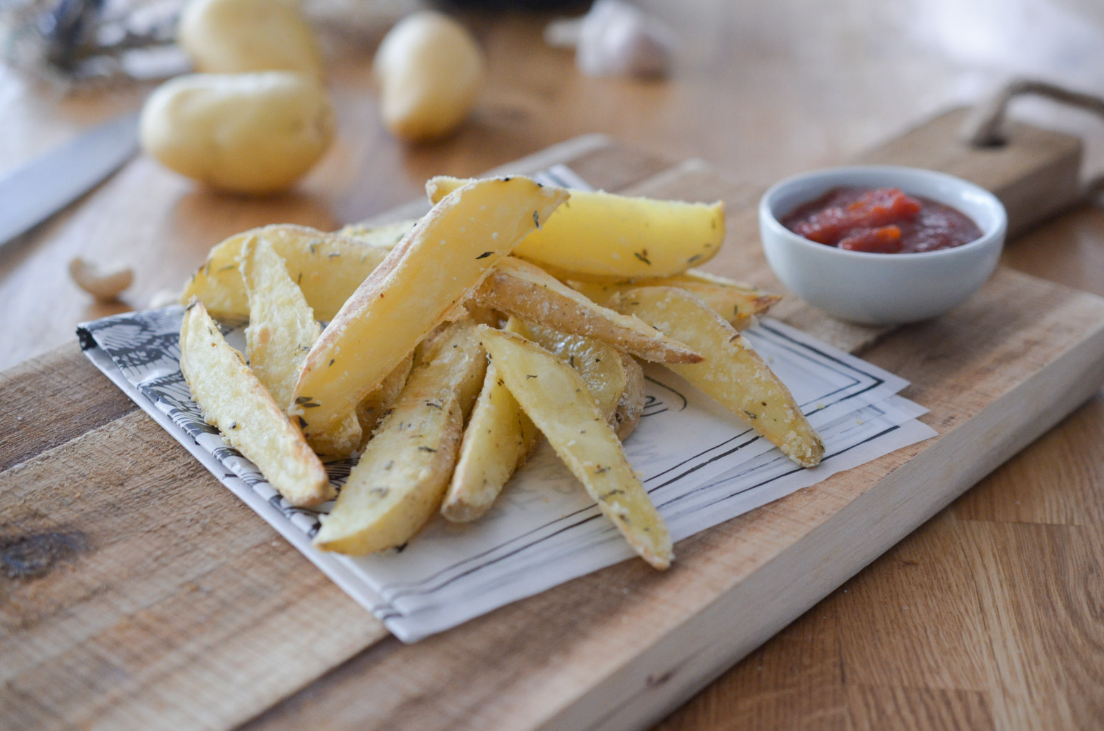 Il est important de disposez les potatoes sur une feuille de papier cuisson, afin qu’elles ne collent pas en cours de cuisson. Evitez absolument le papier aluminium.
