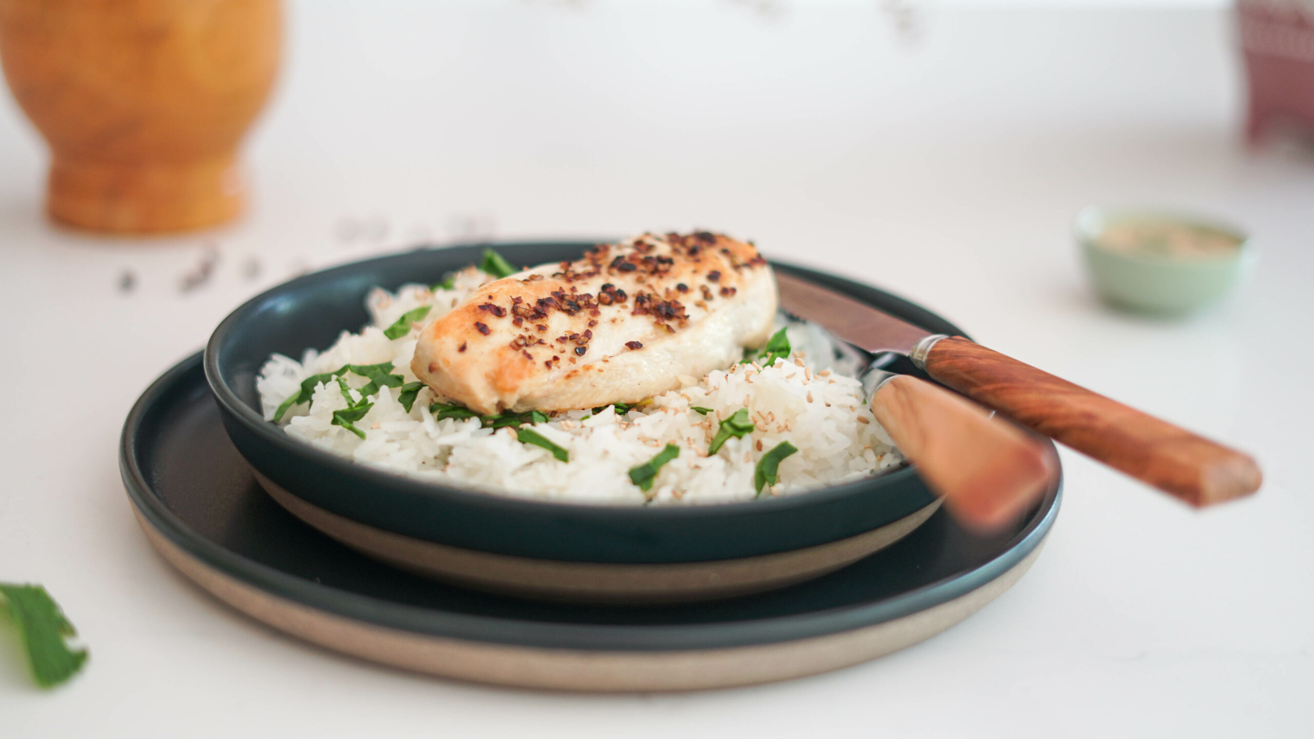 - Déposer du riz dans une assiette, ajoutez les filets de poulet entiers ou coupés en morceaux. Nappez de sauce et terminer par une touche de cébette et de sésame.