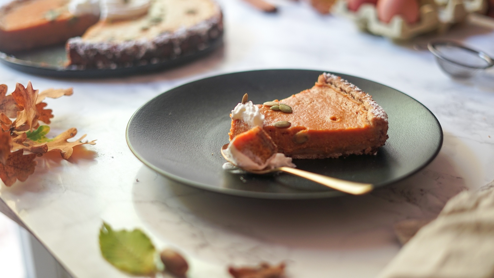 Connaissez-vous la célèbre pumpkin pie américaine ? Je vous propose ici une version toute simple à préparer tout l’automne ou pourquoi pas en l’honneur de Thanksgiving. Ce dessert se déguste bien froid et est meilleur le lendemain de sa préparation. Côté service : soyez généreux sur la chantilly, c’est la petite touche en plus qui fait tout ! ;-)