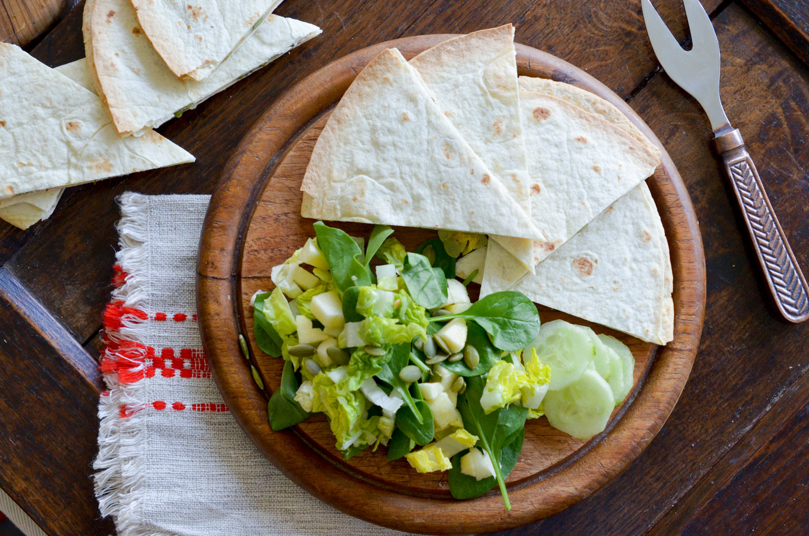 Servez la quesadilla tout juste sortie du four et tranchée en parts accompagnée de la salade assaisonnée.