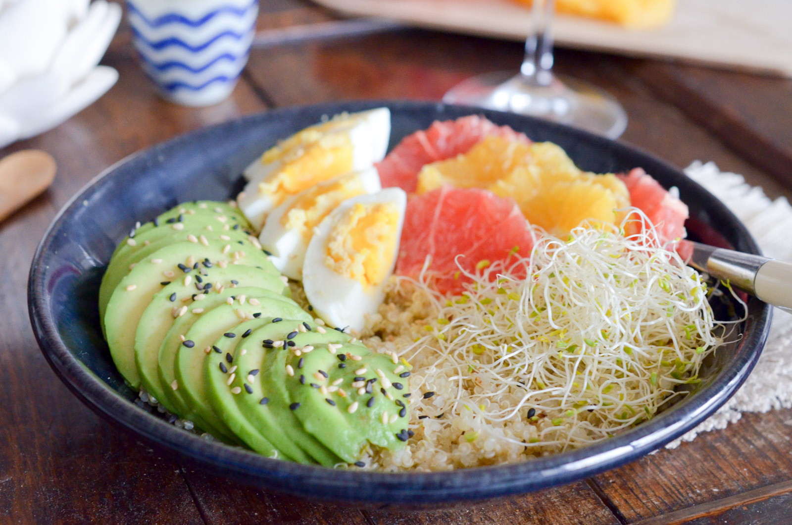Dans vos bols de service, disposez un lit de quinoa, les agrumes, l’avocat, l’alfalfa, l’oeuf coupé en 4 et répartissez la sauce. Servez et mélangez bien tous les ingrédients ensemble avant de déguster.