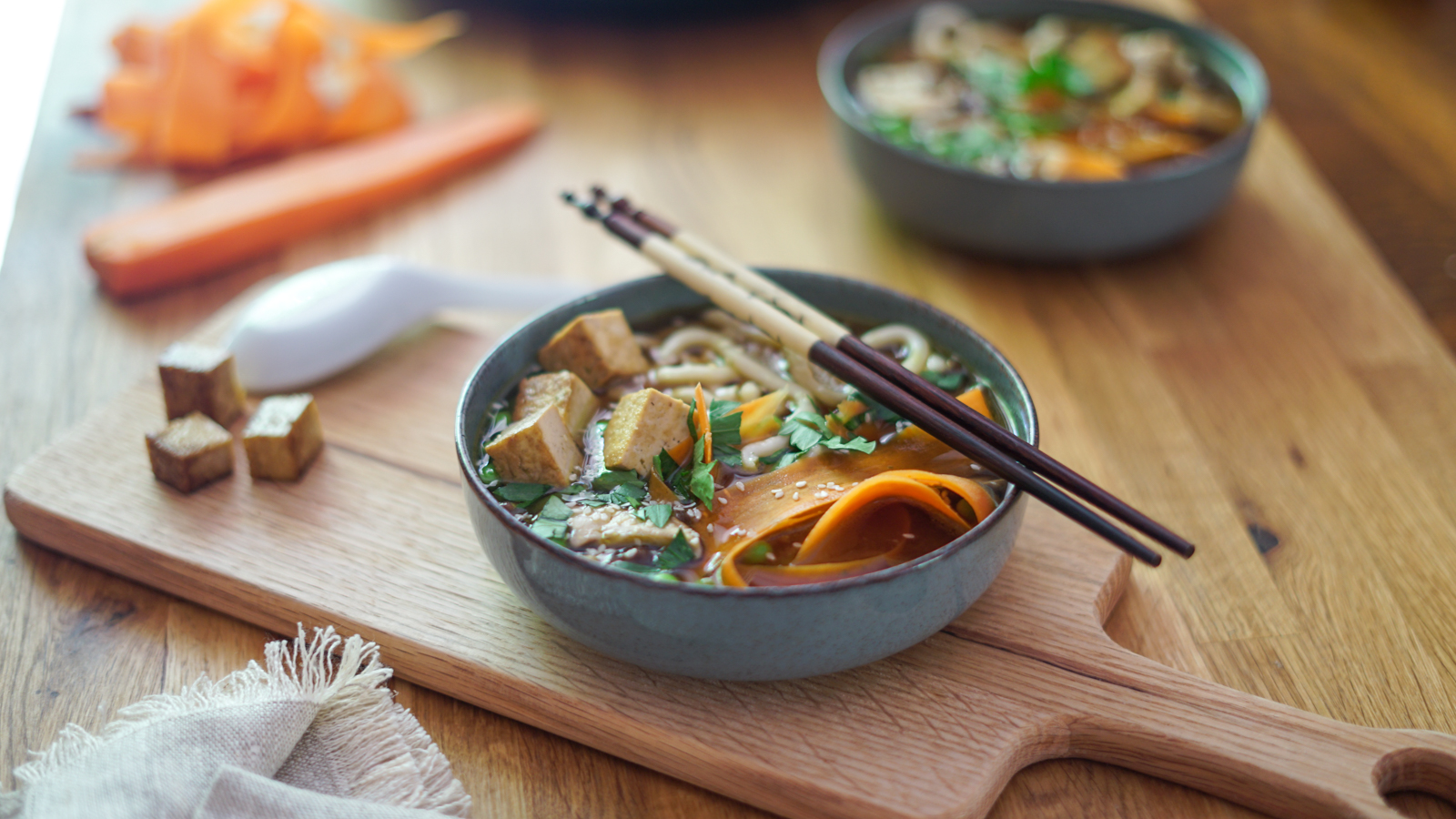 Les ramen… tout le monde en a entendu parler, de près ou de loin… Par ici on en est fan ! Le principe est très simple : il s’agit de nouilles asiatiques servies dans un bouillon parfumé. Le secret est donc la qualité du bouillon, tout simplement. Je vous ai concocté une version toute légère, un poil détox, avec ma version aux carottes et aux champignons. Quant au bouillon, le mieux est de jouer sur la simplicité. Je vous ai mis ici un bouillon miso avec une touche de gingembre et de soja. C’est tout, c’est simple, c’est divinement bon.