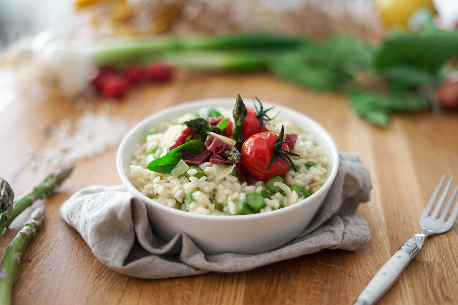 - Dressez votre risotto dans des assiettes creuses en disposant sur le dessus les pointes d’asperges, quelques tomates cerises, le jambon cru, quelques copeaux de parmesan et quelques feuilles de basilic.