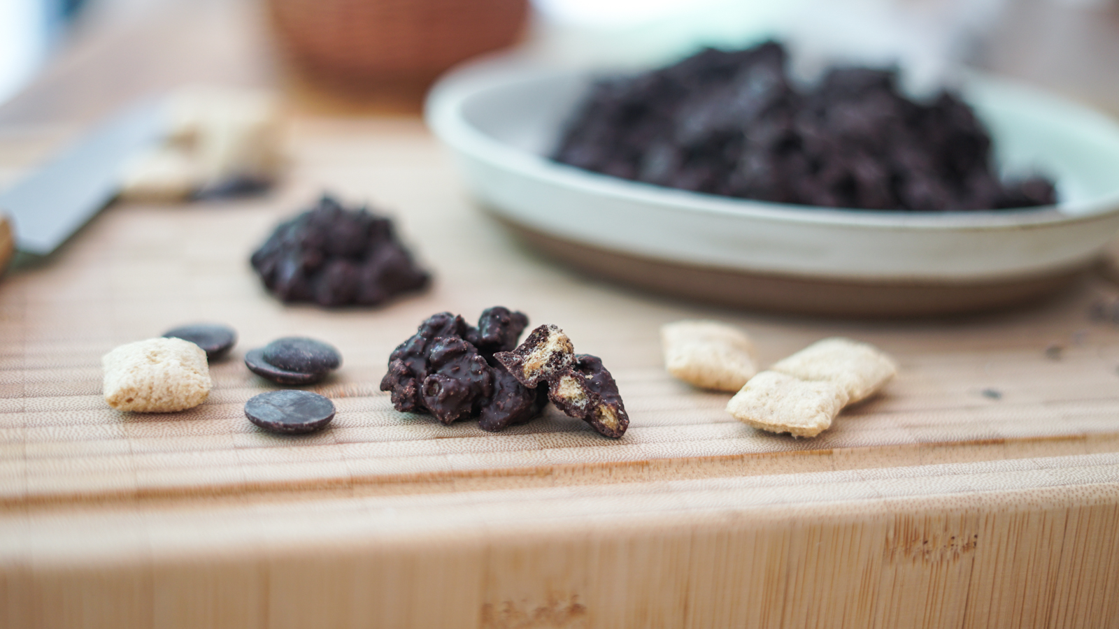 - Versez les céréales concassées dans le chocolat tiédi. Enrobez bien le tout.