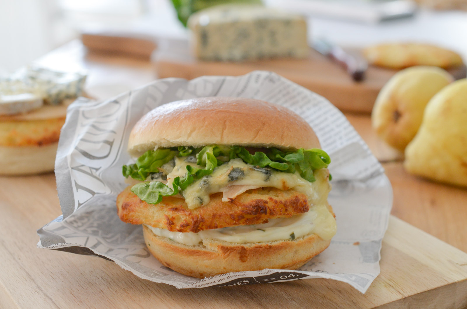 - Coupez les buns en deux, réchauffez-les légèrement, tartinez la face du dessous de crème, ajoutez un rosti de pomme de terre, quelques lamelles de poire, de la Fourme d’Ambert et faites fondre le fromage 5 à 10 minutes au four. Terminez en ajoutant quelques feuilles de salade, refermez avec la seconde moitié du bun et dégustez sans attendre.
