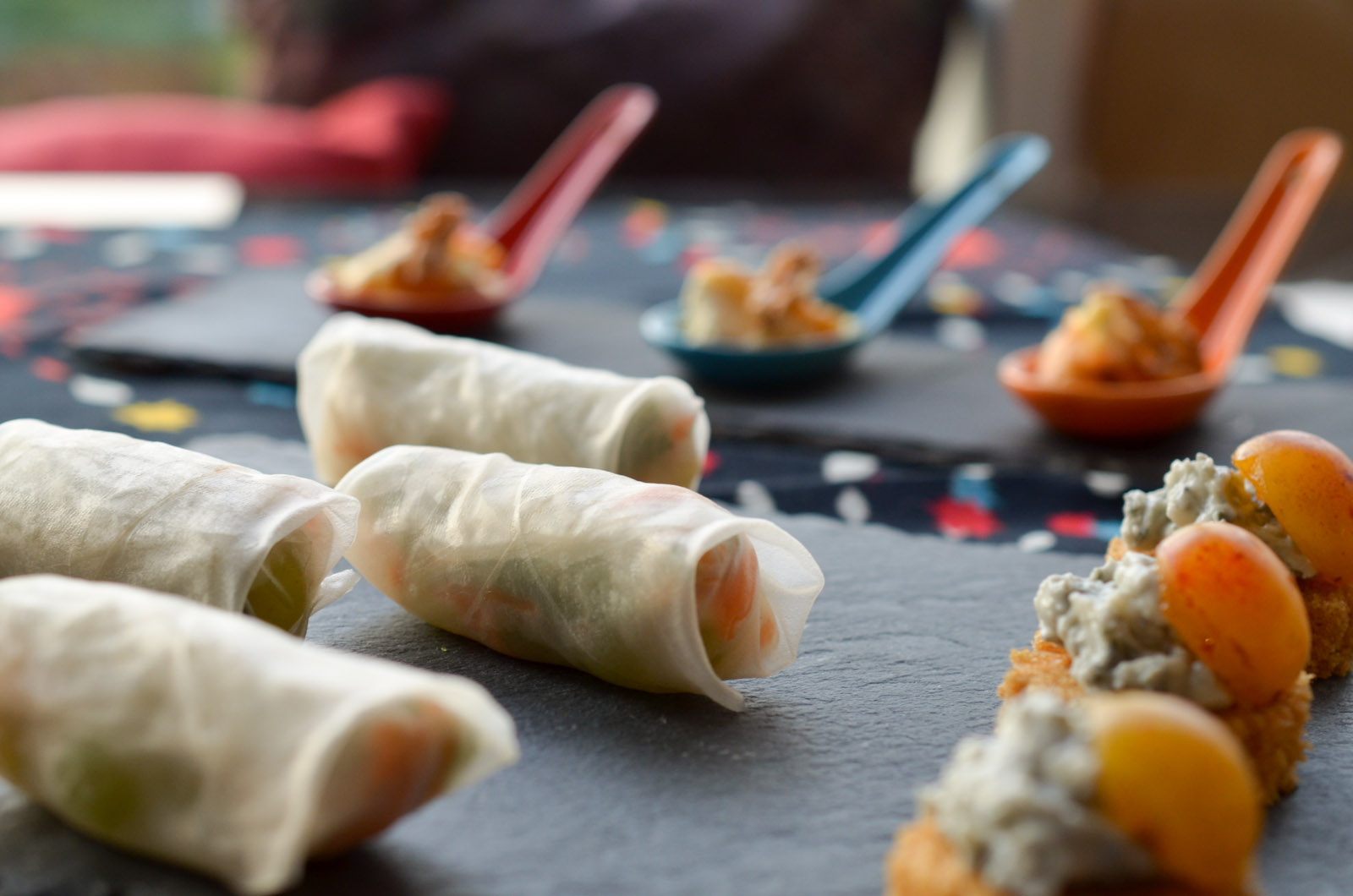 - Mouillez bien une galette de riz. Disposez sur un des bords une belle feuille de menthe. Ajoutez une pousse d’épinard, 1 cuillère à café de carottes râpées, un morceau de brie ainsi que 2 rondelles de raisin (en fonction de la taille de vos raisins). Roulez le tout pour former un rouleau de printemps.