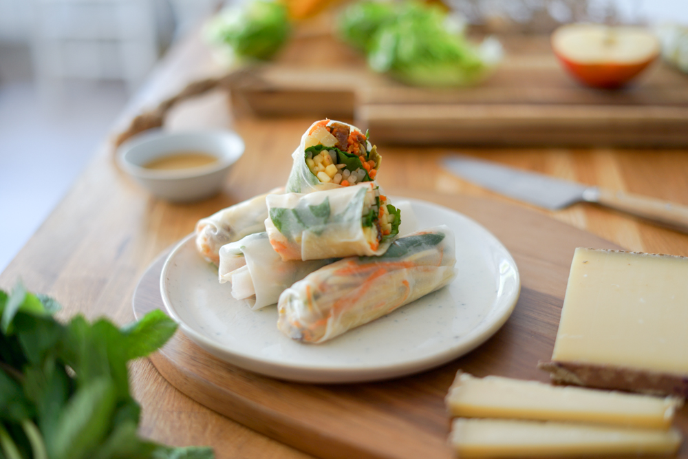 Et hop, encore une belle recette de rouleau de printemps en version fromagère. Aujourd’hui je vous propose d’ajouter une touche de Comté, c’est merveilleux. Pour un beau mariage avec la feuille de riz, j’aime bien y rajouter du croquant et du sucré. Du sucré apporté par la pomme et les raisins secs, du croquant apporté par la carotte, les pousses de soja et les graines de courge.