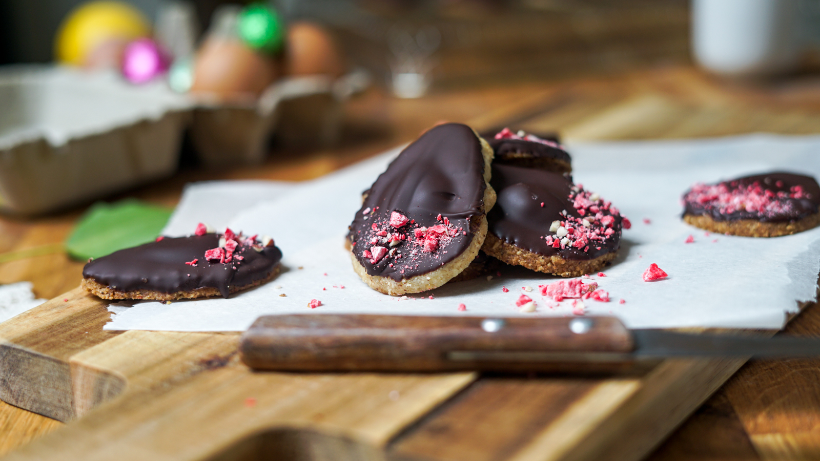 Pour changer des oeufs 100% chocolat, je vous propose de réaliser ces petites gourmandises pour Pâques : des biscuits sablés en forme d’œuf, fourrés à la confiture et recouverts d’une couche croquante au chocolat. Merveilleusement bon ! Je vous ai mis ici une recette de biscuits sablés à l’amande, toute simple et sans œufs, assez friable et addictivr. Mais vous pouvez utiliser votre recette favorite de biscuit sec : petit beurre, galette bretonne, shortbread, tout fonctionne.
