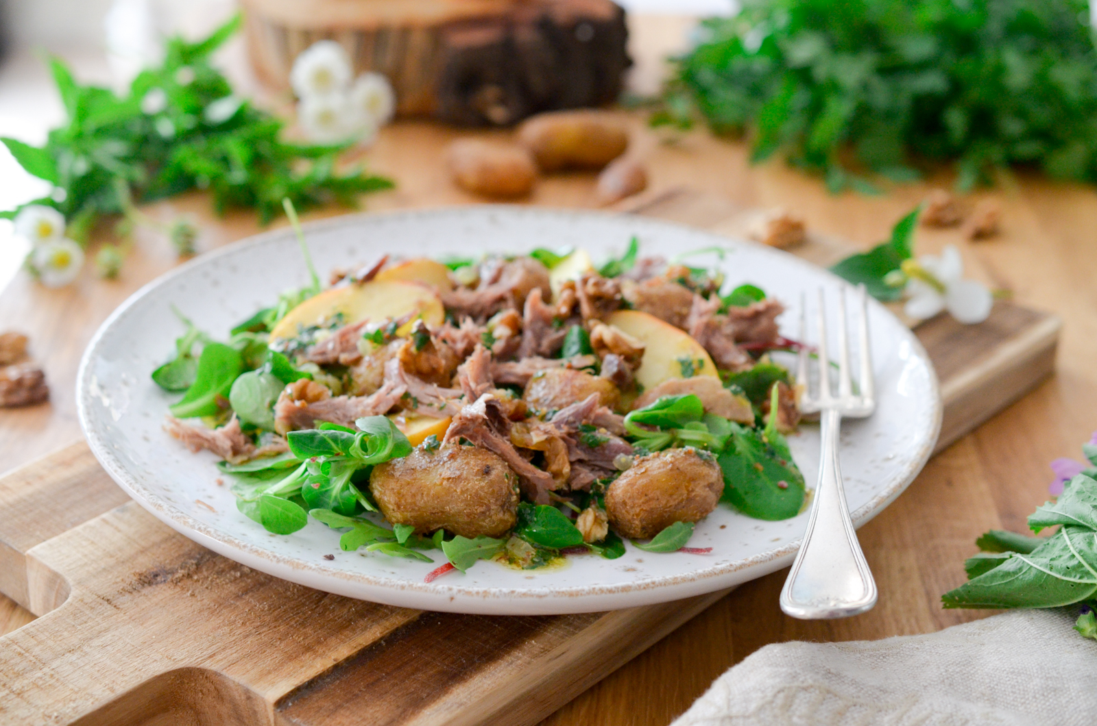 Même en hiver, les salades ça fait du bien ! Je vous propose donc une salade au confit de canard du Sud Ouest. Une recette bien réconfortante et généreuse avec du canard bien sûr, mais aussi des pommes de terre, une touche de noix croquantes et quelques morceaux de pommes bien sucrées.