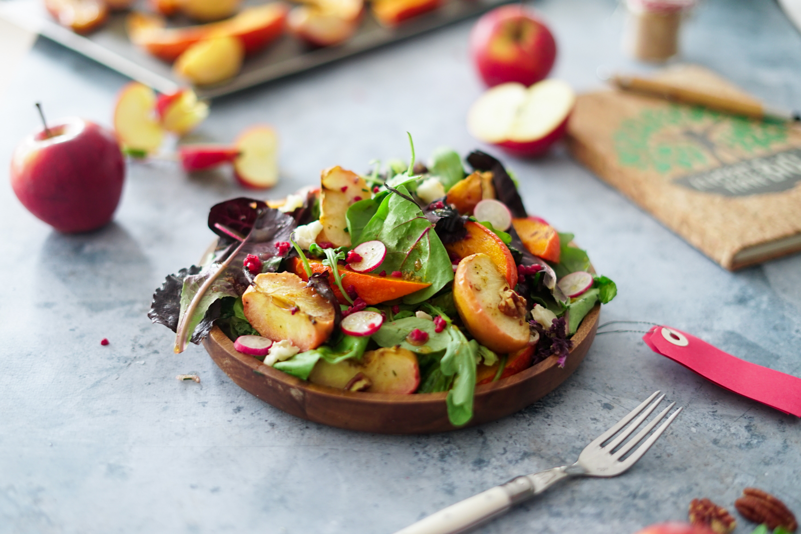 Côté recette, c’est très simple : je fais simplement rôtir au four des gros morceaux de pommes avec de la courge et une pointe de curry. Ensuite j’assemble le tout avec la vinaigrette, quelques feuilles de salade et des noix de pécan légèrement torréfiées.