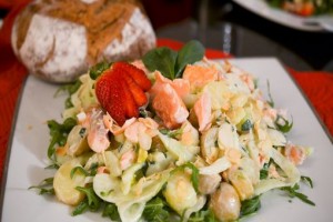 - Sur vos assiettes de service, disposez un lit de roquette, ajoutez votre préparation, décorez avec le saumon restant ainsi que le basilic, quelques amandes effilées légèrement grillées à la dernière minute et des zestes de citron.
