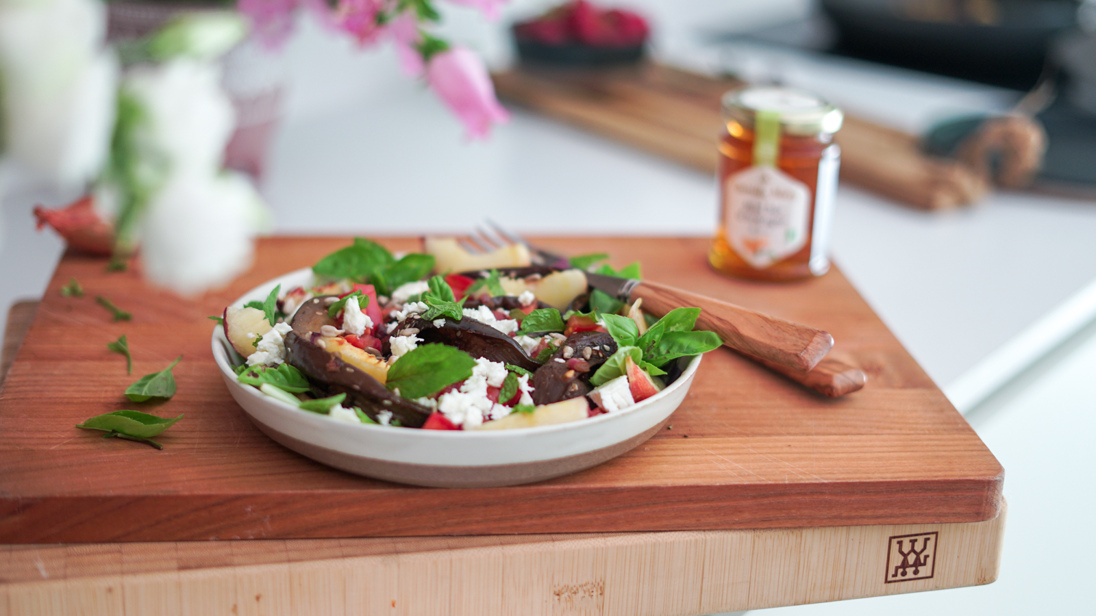 - Dans votre plat de service, disposez un lit de salade, ajoutez les aubergines, quelques dés de tomate, la pêche coupée en quartier, la fêta émiettée, les graines et terminez par les herbes fraiches et un filet d’huile d’olive.