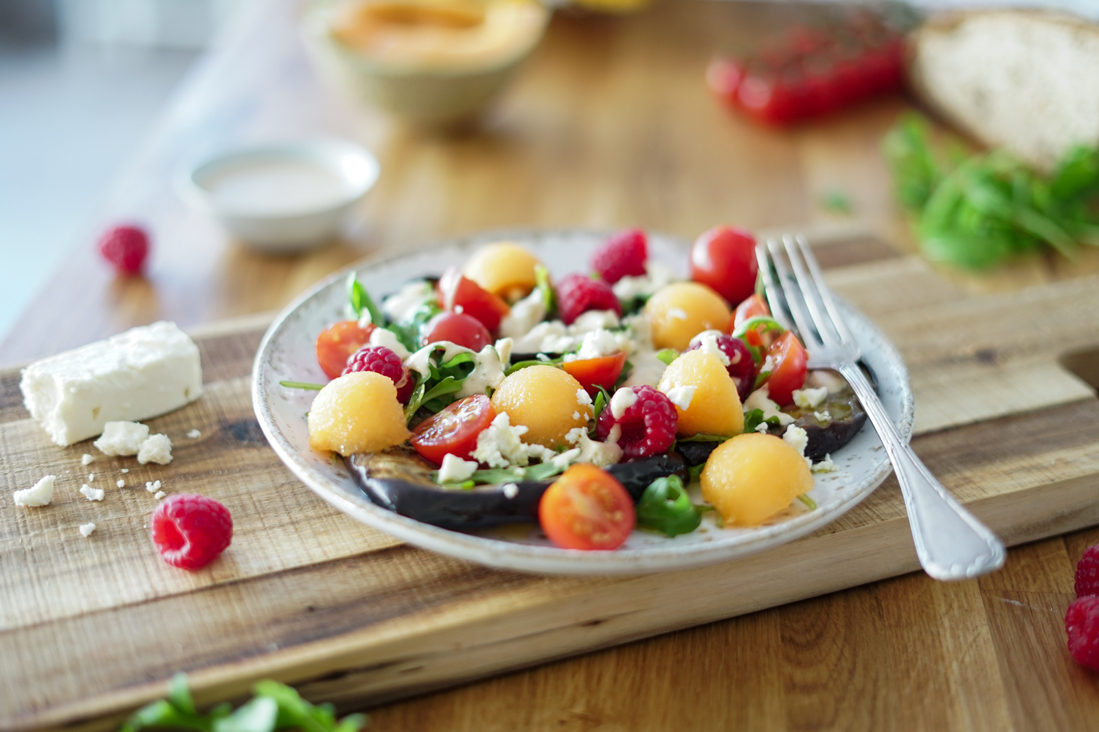 - Dans vos assiettes de service, disposez un lit de roquette. Ajoutez les aubergines, les tomates cerises, le melon, les framboises, et terminez par la feta émiettée.