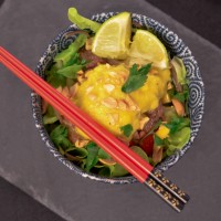- Disposez harmonieusement vos cubes de légumes et les tranches de viandes. Arrosez généreusement de sauce à la mangue, puis disposez les cubes de mangue réservés, les cacahuètes légèrement concassées, quelques feuilles de coriandre et des quartiers de citron vert.