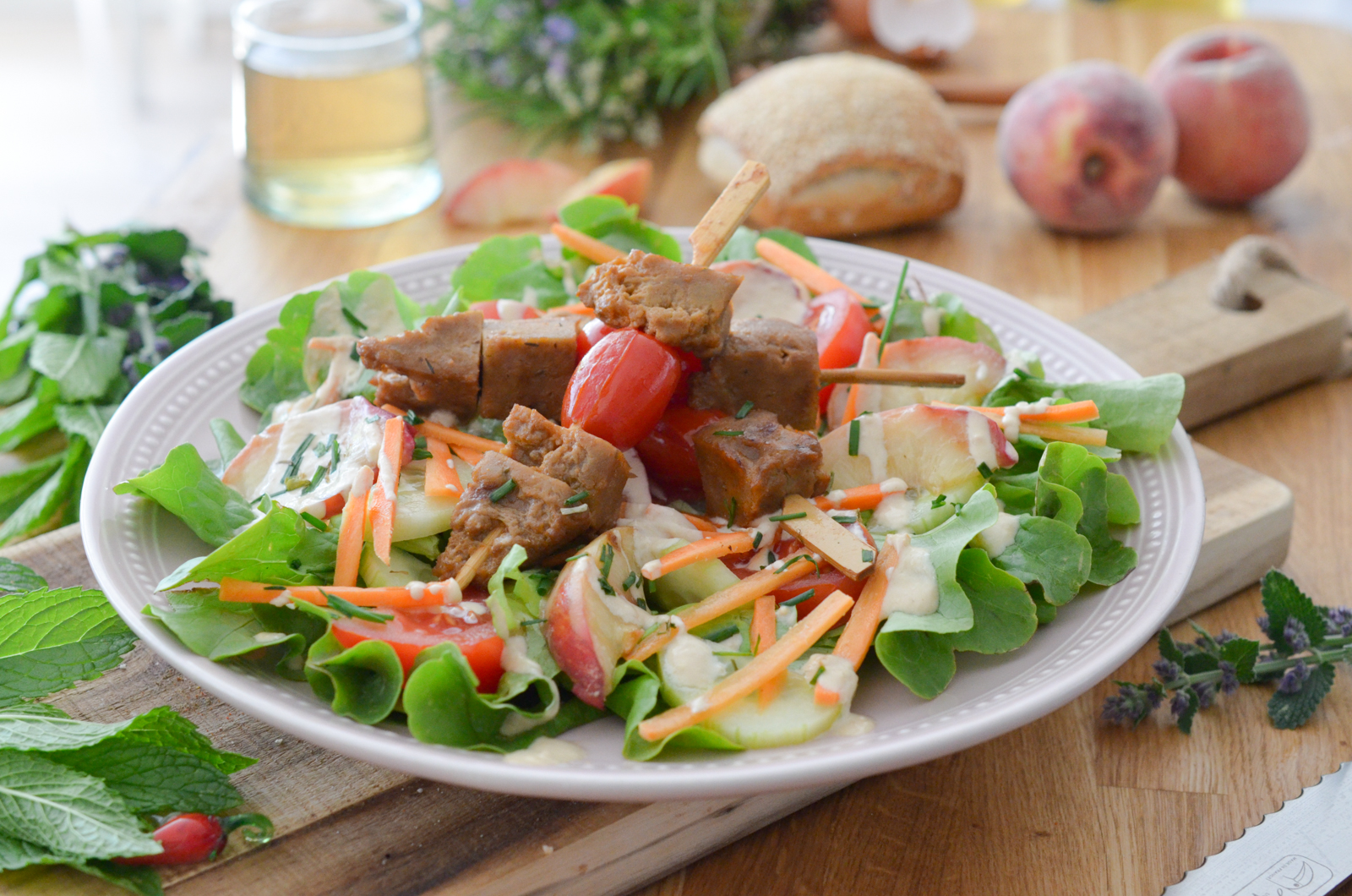 - Dans vos assiettes de service, disposez un lit de salade. Ajoutez les tomates, le concombre, les carottes les morceaux de pêche, l’oignon nouveau, ainsi que les brochettes de seitan. Arrosez de sauce et dégustez sans plus attendre.