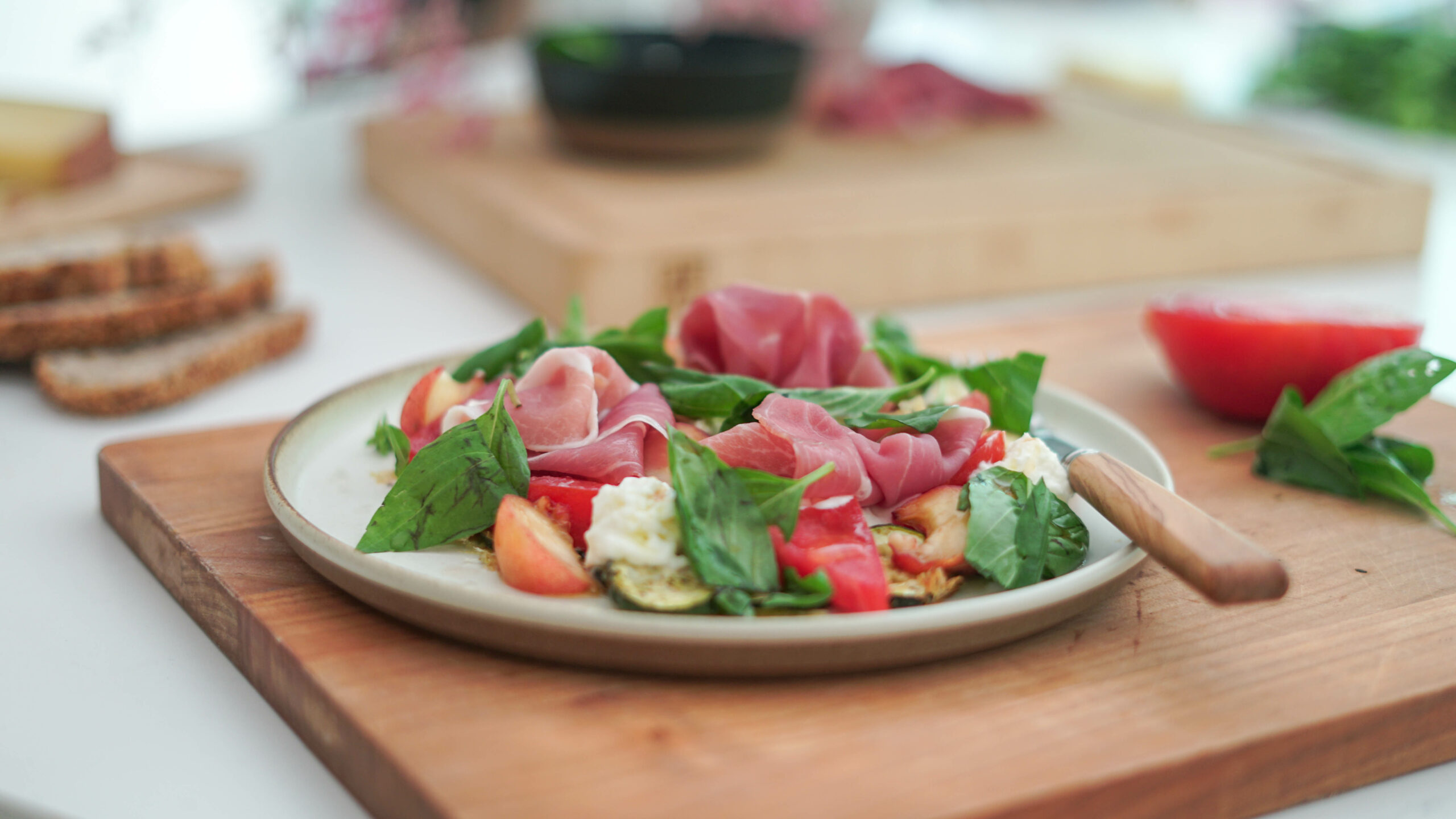 4. Lorsque les courgettes sont cuites, laissez tiédir quelques minutes avant de les déposer dans votre plat de service. Ajoutez les tomates, les pêches, la burrata, parsemez de fleur de sel, de poivre et terminez avec les tranches de jambon cru et le basilic. Arrosez généreusement d’huile d’olive et de vinaigre balsamique