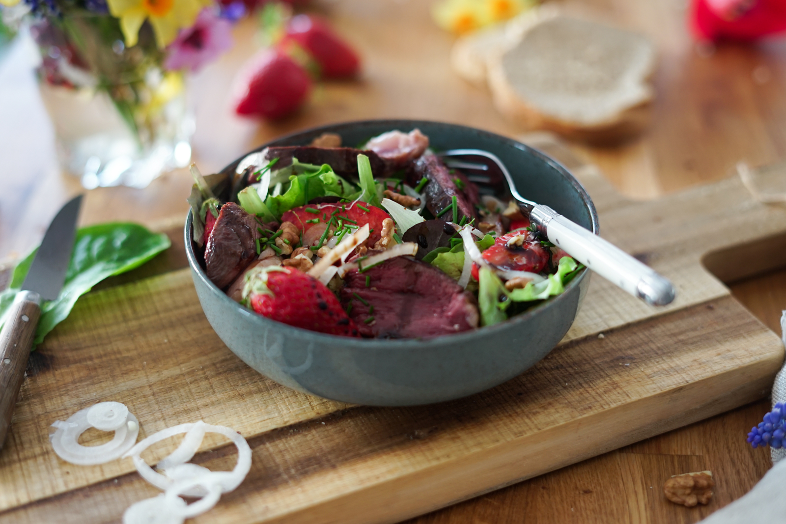 Comme une envie de fraicheur… avec cette salade de magret aux fraises ! J’ai très souvent tendance à manger le magret de canard de manière classique : avec un accompagnement chaud, des petites pommes de terre et des haricots verts à l’ail ou autre. Mais c’est également très bon avec une simple salade.