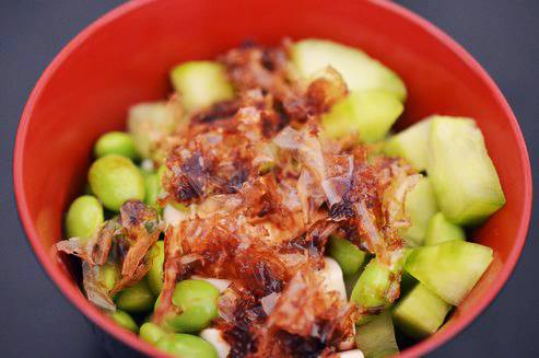 - Coupez le tofu en cubes d’1cm d’épaisseur, placez dans des bols individuels, rajoutez les fèves et le concombre, puis versez la sauce par dessus.
