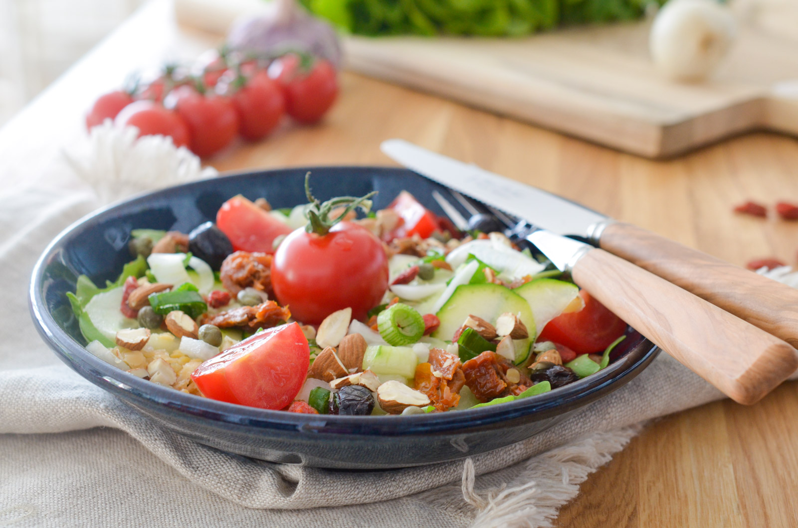 Des lentilles corail, des baies de goji, des amandes, du citron, plein de légumes frais et croquants… je nomme cette salade la salade énergie ! Très fraiche et pleine de bonnes choses, c’est une recette de salade complète, parfaite pour l’été et assez rapide à préparer.