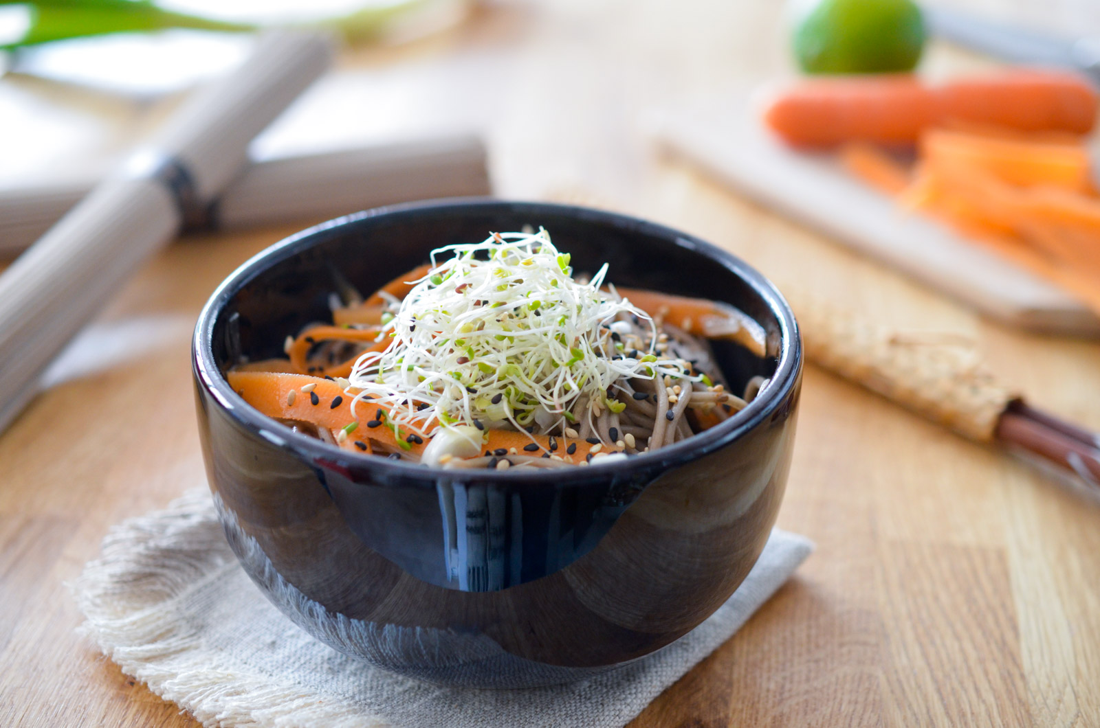 - Cuire les pâtes soba 5 minutes (ou le temps indiqué sur votre paquet de pâtes), égouttez et rincez abondamment à l’eau froide.